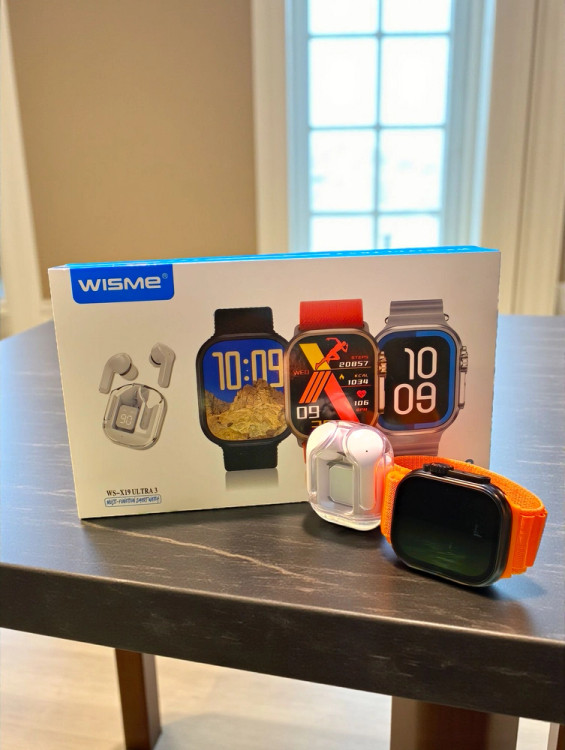 ساعت هوشمند مارک WISME مدل WS_X19 ULTRA 3 که به همراه یک هندزفری بلوتوثی یا همان ایرپاد به بازار عرضه شد از یک صفحه نمایش تمام رنگی 49 اینچی فول تاچ برخوردار بوده و در پشت ساعت سنسورهای سلامتی از جمله سنسور ضربان قب و سنسور سنجش میزان اکسیژن خون و گام شمار تعبیه شده است . خوش طرح و خوش ساخت و جنس بدنه آن از فلز مقاوم می باشد . به همراه بند سیلیکونی که داخل بسته بندی محصول است به مچ دست بسته شده و به دلخواه کاربر امکان استفاده بر روی هر دو دست میسر می باشد و امکان تعویض بند و اتصال بند انتخابی مصرف کننده را دارا می باشد . از طریق بلوتوث به گوشی همراه متصل و امکان پاسخ گویی به تماس های دریافتی از طریق میکروفن و اسپیکر جایگذاری شده داخل ساعت میسر می باشد . برنامه هایی کاربردی از جمله ماشین حساب – شماره گیره – کنترل شات عکس گوشی همراه و … . از طریق اپلیکشن به تلفن همراه و متصل و اجازه دسترسی به مکان و اعلانات و حتی تغییر تم ساعت از این تغییر میسر می باشد . همچنین امکان به روز رسانی نیز از همین طریق برای ساعت میسر می باشد. دارای شارژر نیز می باشد که بایستی با آداپتور شارژ مناسب شارژ گردد.