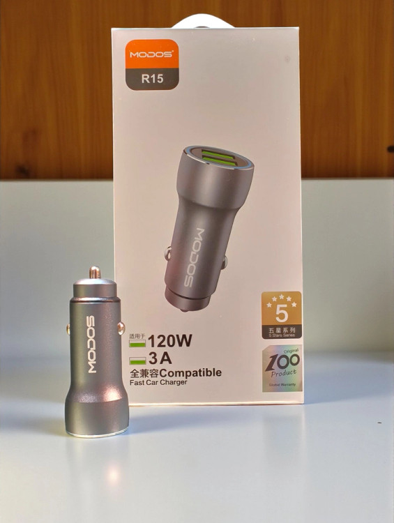 شارژر فندکی r15 از برند modos یا کیفیت عالی و دارای دو عدد خروجی یکی از خروجی ها 120w و یکی دیگر3A در تیتانیوم مناسب ماشین